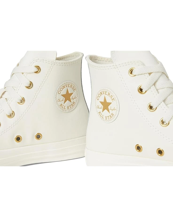 - Let your little one step into timeless style wearing the Converse Kids Chuck Taylor® All Star® Gold Luxe. Featuring a premium leather upper with metallic gold accents, this sneaker blends iconic design with a dash of luxury. The soft cotton lining and EVA insole ensure cushioned comfort for active days, while the durable rubber outsole and lace-up closure keep every step secure. An ankle-high silhouette, complete with the iconic Chuck Taylor ankle patch and All Star license plate, adds a classic touch to their look.