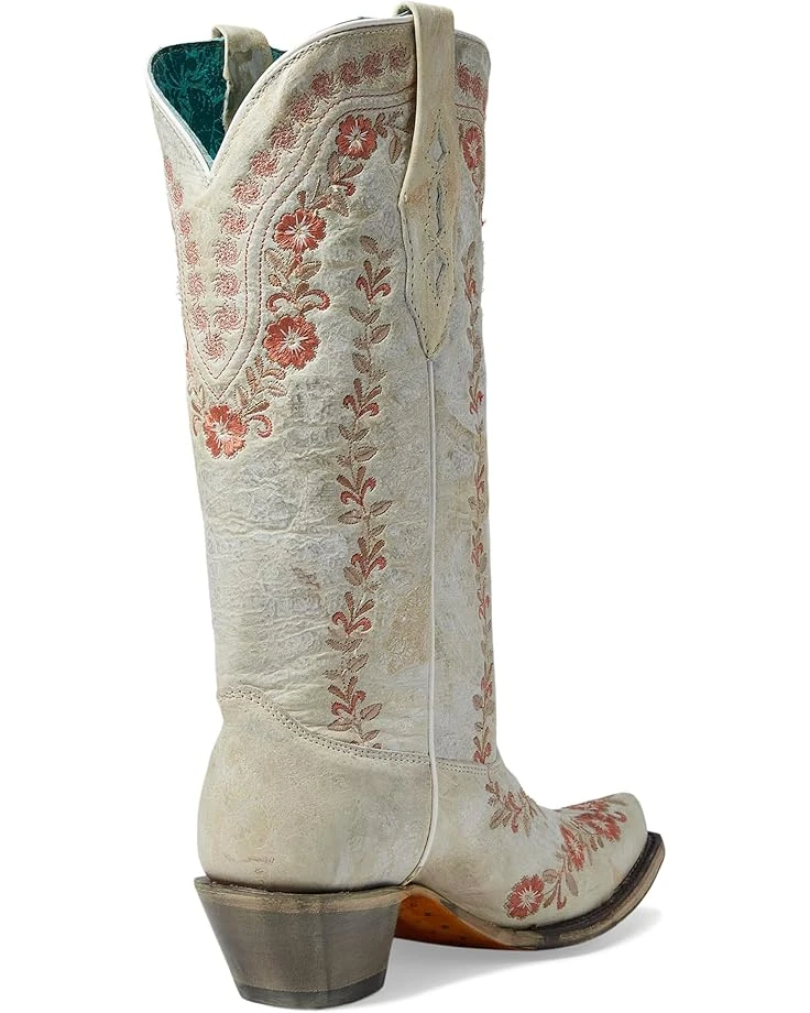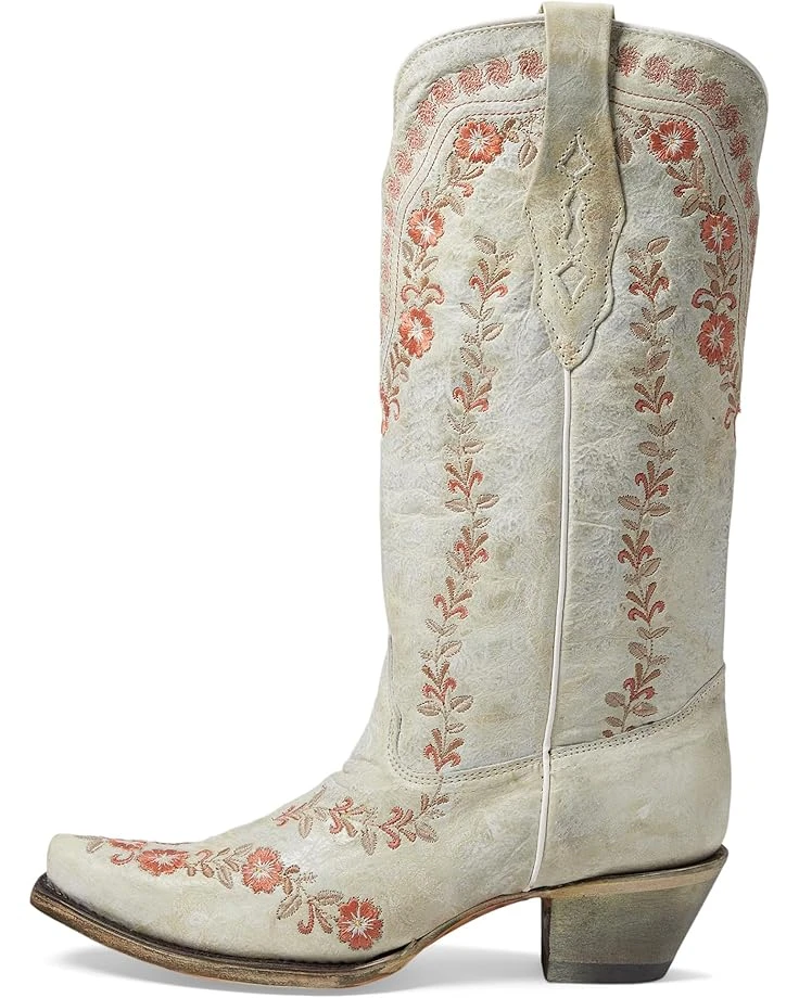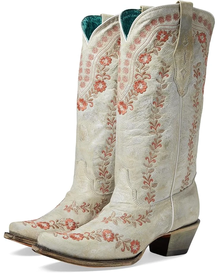 - Featuring a premium leather upper with a striking floral embroidery work, a leather lining, and a cushioned leather insole, the Corral™ Boots A4455 ticks off each and every box when it comes to an investment-worthy footwear. The shoes highlight a snip toe perfectly balanced by a western block heel and come in an easy pull-on style.
