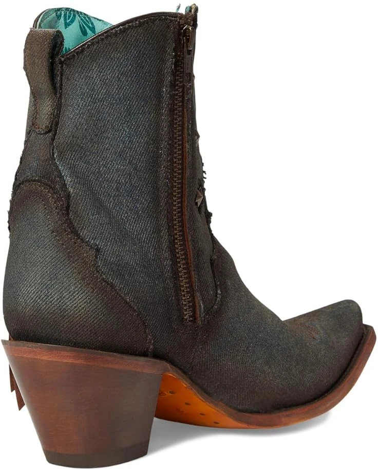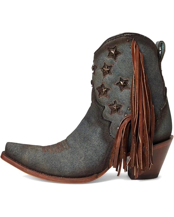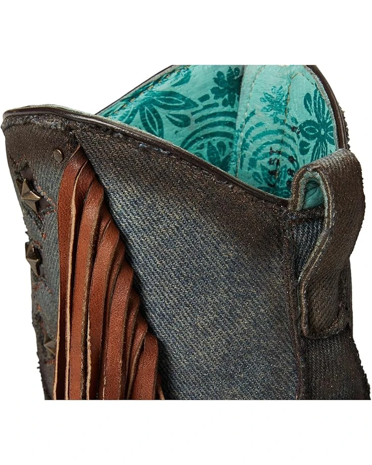 - The modern cowgirl: Step into bold, western-inspired style adorning Corral™ Boots A4675. These ankle boots combine edgy fringe detailing, intricate denim inlay, and eye-catching star studs for a look that commands attention. The luxurious leather lining, insole, and outsole ensure maximum comfort while providing durability with every step. Featuring a classic snip toe and a sleek Cuban heel, these boots offer a perfect balance of sophistication and flair. The zippered side closure provides ease of wear, making these boots as practical as they are stylish.