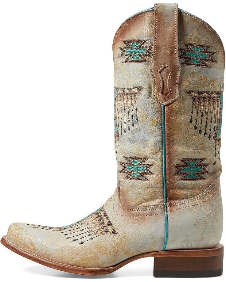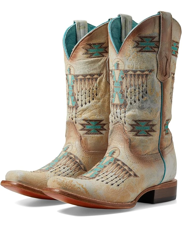 - Give your look a refined touch wearing the Corral™ Boots Z5219, which come in a mid-calf silhouette with intricate lady white-turquoise embroidery on the shaft and a square toe detail. The pull-on style equestrian boots come with a leather upper, leather lining, and a leather insole. The block heel is added for an elevated touch.