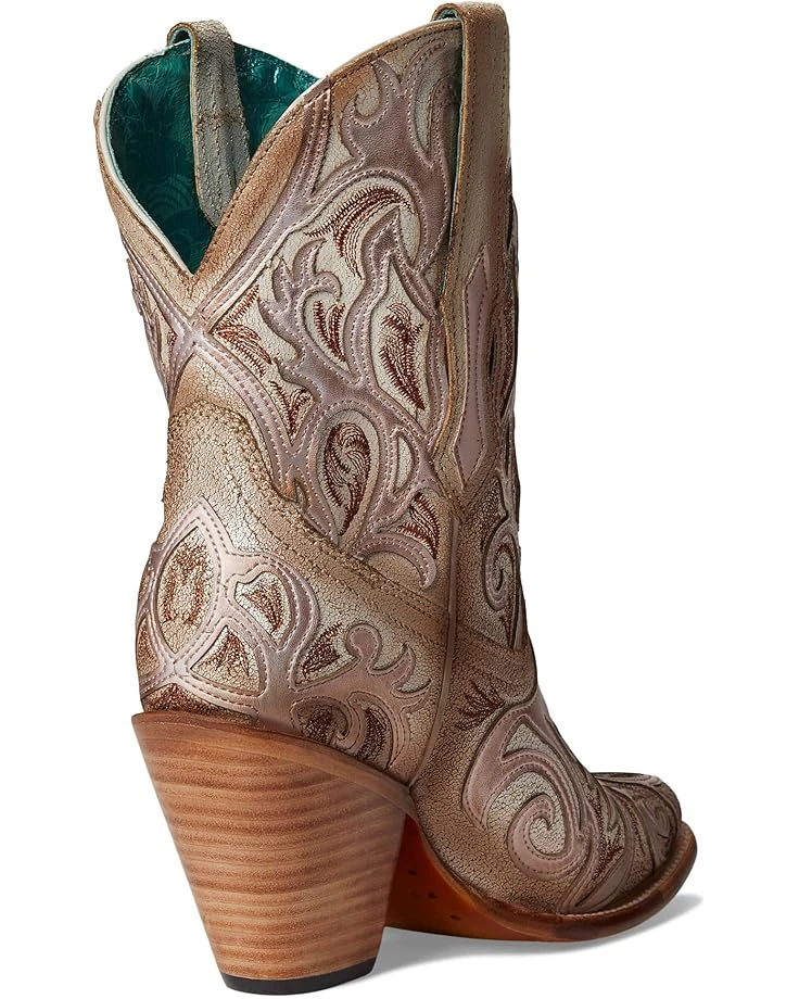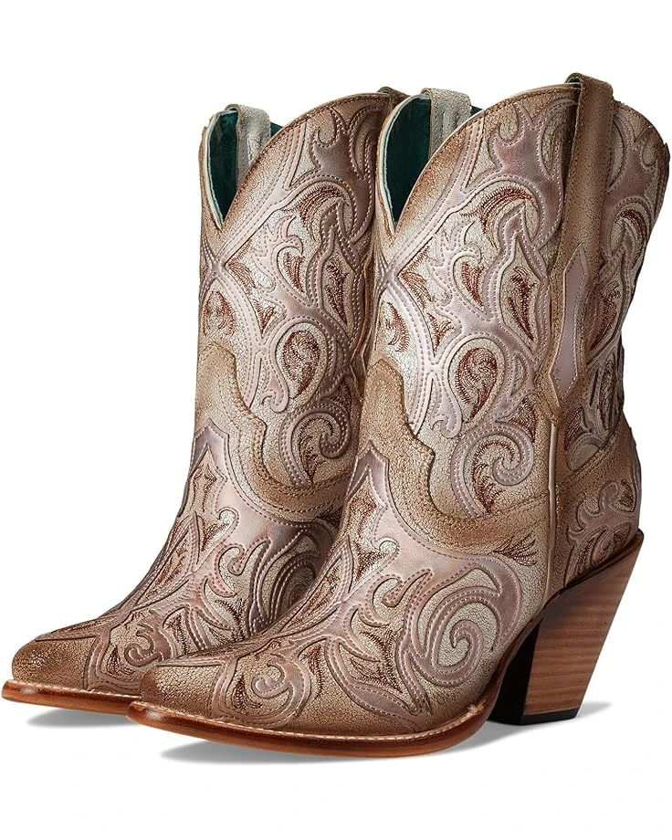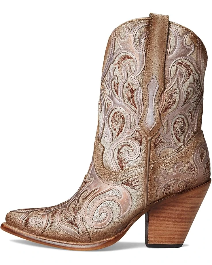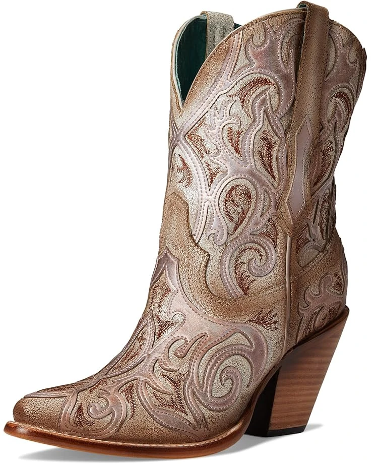 - The West, with a twist: Corral™ Boots Z5258. These ankle-high stunners boast a premium leather upper, lining, insole, and outsole, ensuring durability with a luxuriously soft feel. The pointed toe and Cuban heel create a sleek, elongating silhouette, while intricate overlay and embroidery details add a touch of rustic charm. Designed for effortless wear, the pull-on style ensures quick and easy styling, making them a go-to for any occasion.